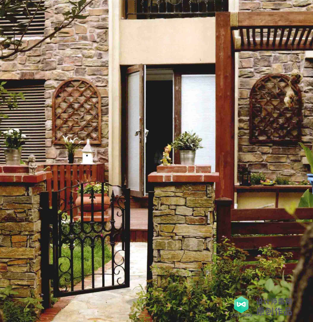 色调柔和的庭院入口,庭院的入口色调与建筑立面十分融合,偏黄的暖色调文化石门柱与葱郁的绿植,深红棕色的防腐木围栏形成清丽的色彩组合。低矮的围栏使庭院似隔非隔,庭院内的木格栅装饰,防腐木花架等从庭院那一点点透射出来。